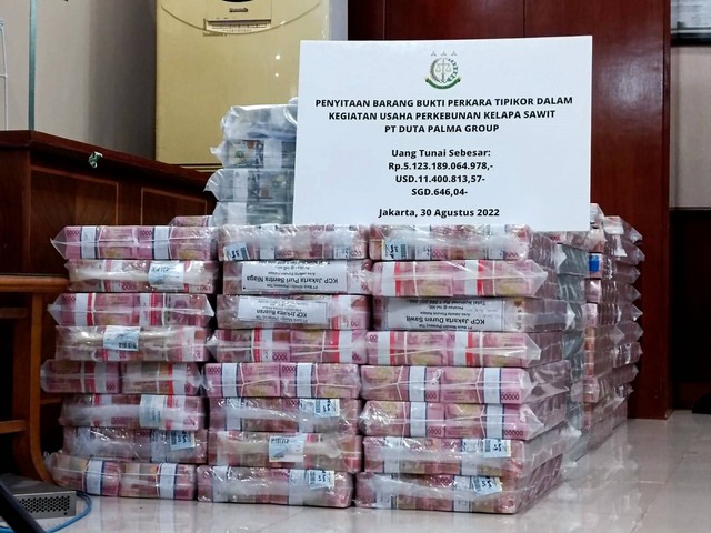- Kejagung menyita Rp 450 miliar terkait kasus dugaan korupsi korporasi Duta Palma Group. Uang ini disita dari tersangka PT Asset Pacific yang merupakan satu group dengan PT. Duta Palma Group.